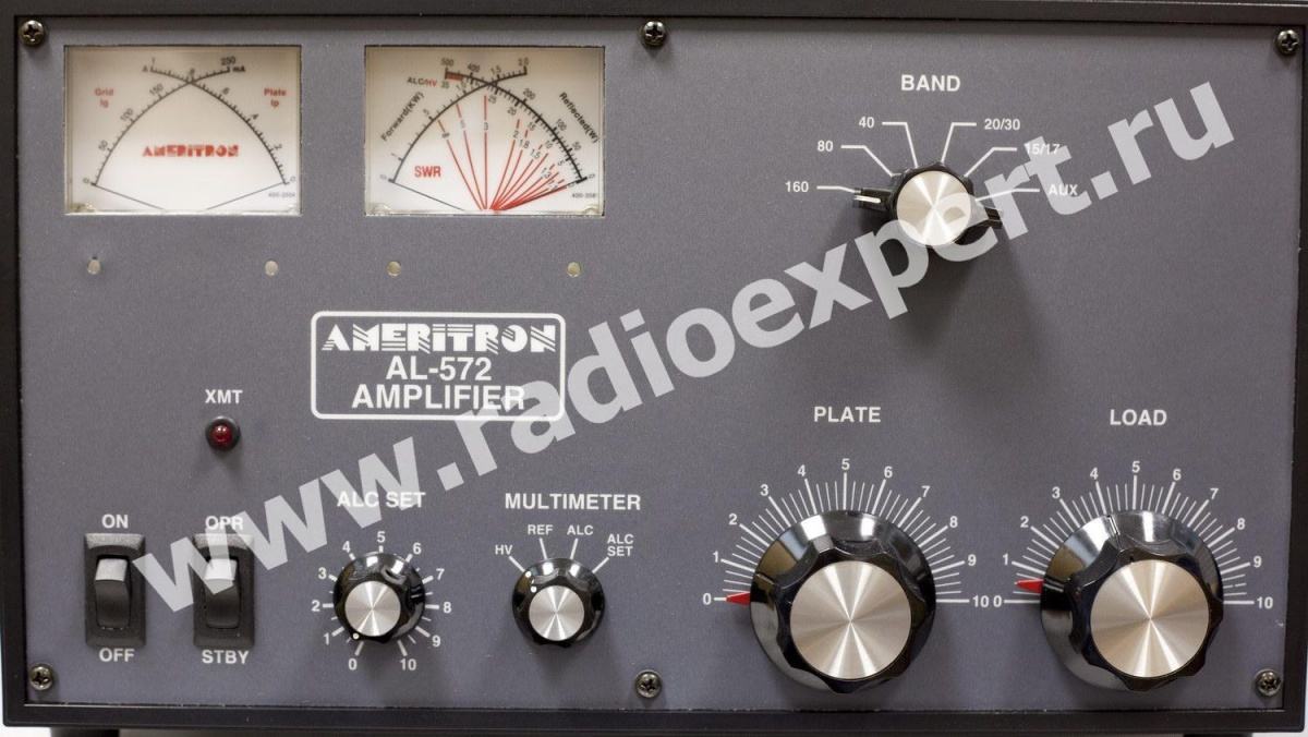Усилитель Ameritron AL-572, также имеет систему ALC, переключатель режимов работы и обхода, индикацию работы на передачу и приборы для измерения напряжения источника анодного питания/тока анодов и величины сеточного тока. Оба прибора измерения имеют подсветку. Для работы QSK возможна установка дополнительного модуля QSK-5.